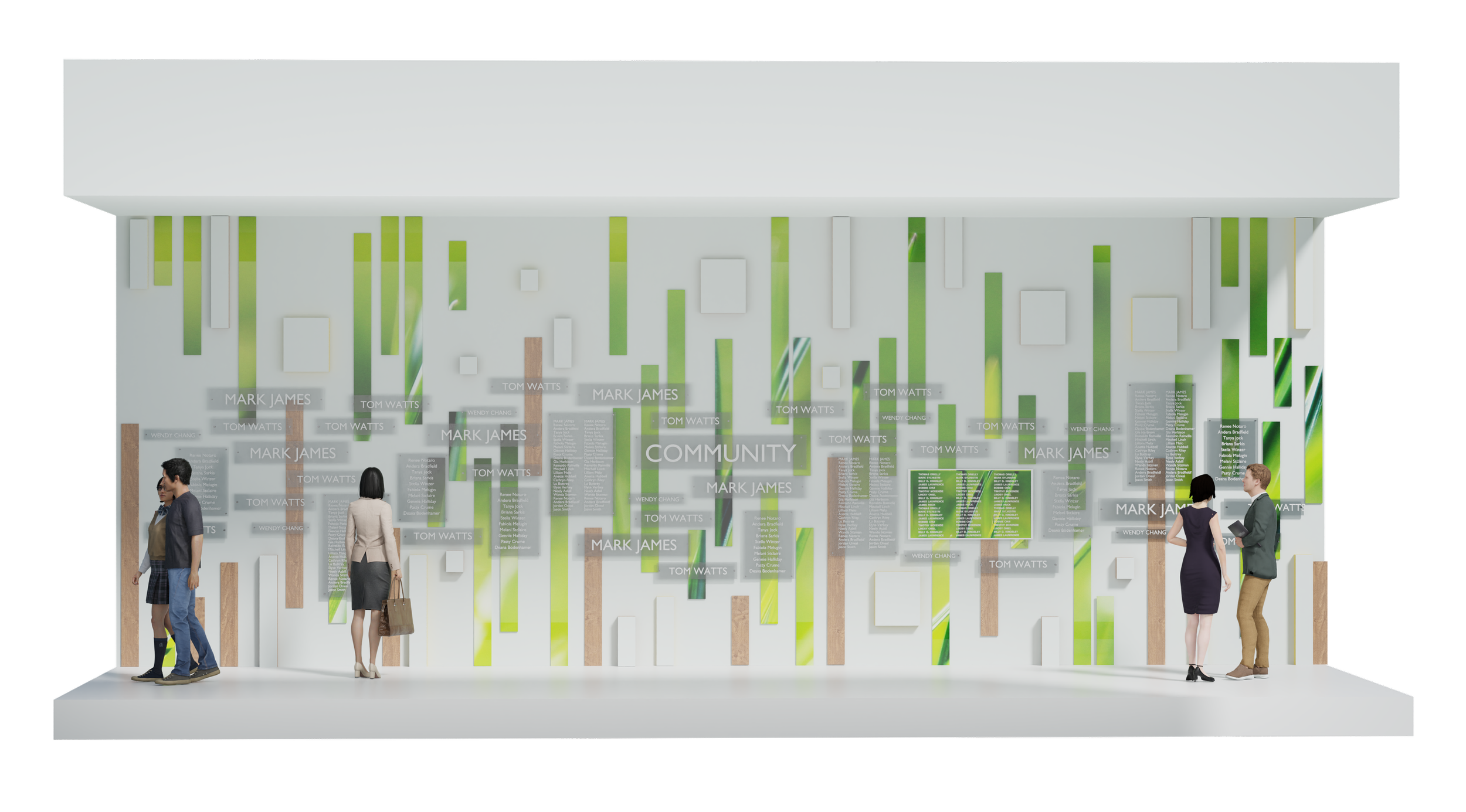 The Healing Canopy draws inspiration from Atlanta’s identity as a “city in a forest,” celebrated for its expansive tree canopy that enhances the city’s beauty, purifies the air, cools urban spaces, and fosters a sense of comfort and healing. Reflecting the layered structure of evergreen forests, the artwork symbolizes the harmony and resilience found in nature. From the vibrant energy of the forest floor to the serene light of the canopy, the design mirrors the patient’s journey to wellness while celebrating Atlanta’s lush urban landscape. The donor wall complements this narrative, integrating gratitude and community into the healing environment.